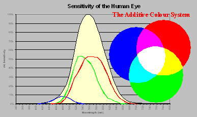 Here we found that the total sensitivity is splitted into three (3) sensitivity ranges, the blue, green and red shown from left to right. The additive colour system than enables our colour vision.