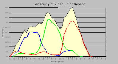 Same as for the human eye we find three independent ranges of sensitivity. The blue, the green and the red channel are forming the total sensitivity s (l), which is given by Sblue (l) + Sgreen (l)